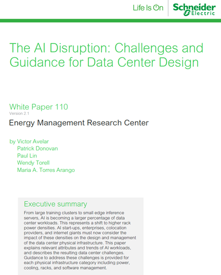 Artificial Intelligence is transforming data center workloads, driving a shift to unprecedented rack power densities and complex infrastructure demands. The AI Disruption: Challenges and Guidance for Data Center Design explores how AI training clusters, inference servers, and rapidly advancing GPU technologies are reshaping power, cooling, rack, and management strategies. The paper outlines the physical and operational challenges—from voltage distribution and arc flash safety to liquid cooling adoption and advanced rack configurations—and offers practical guidance for both new builds and retrofits. With AI workloads projected to consume 15–20% of all data center energy by 2028, Schneider Electric’s experts provide actionable insights to help operators design resilient, efficient, and future-ready facilities capable of supporting the next generation of AI innovation.